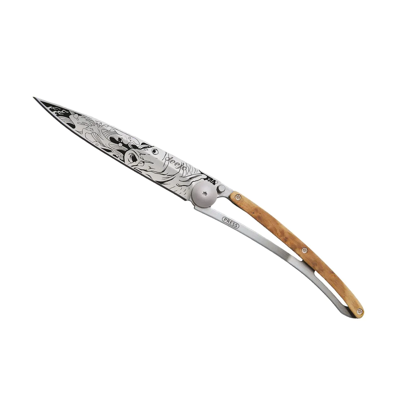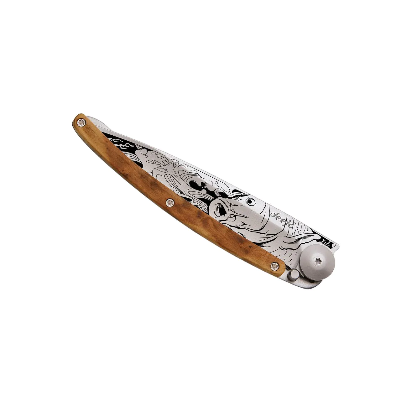 Ultraleichtes Messer aus Z40C13 Edelstahl mit matter Oberfläche. Klinge mit ‚Liner-Lock‘ Sicherheitssperre dekoriert mit einem wuderschönen Karpfen. Gürtelclip. Der Griff ist mit Wacholderholz besetzt. Wacholderholz ist ein Holz, das einen leicht würzigen Duft verströmt. Die feine natürliche Maserung verleiht jedem Deejo ein individuelles Aussehen. Ein hochwertiges Taschenmesser für Angler.