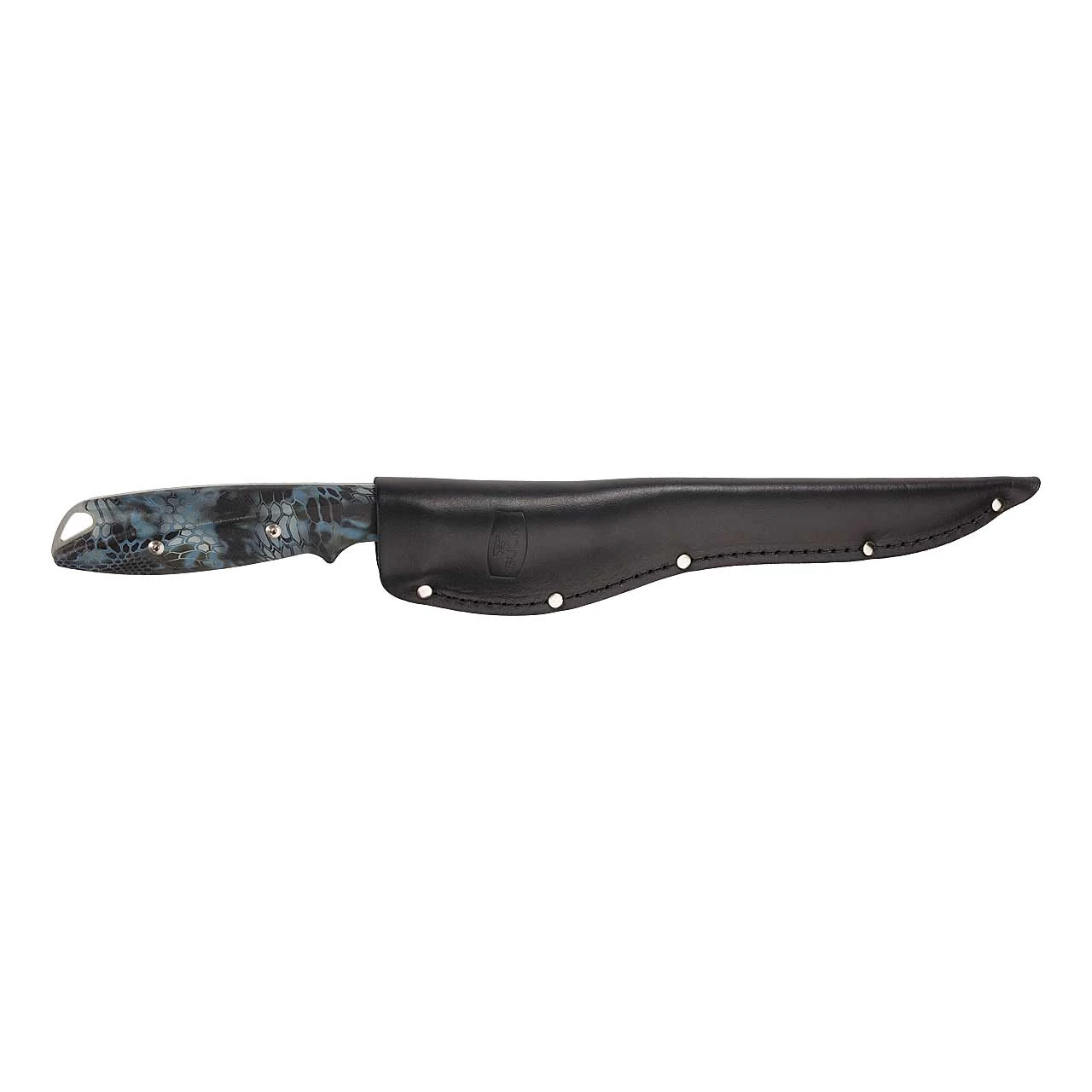 Die Spitze der flexiblen Klinge aus rostfreiem 420 HC Stahl ist zum leichteren Verarbeiten des Fangs auch auf dem ersten Zentimeter des Rückens scharf geschliffen. Der ergonomisch geformte Griff aus glasfaserverstärktem Nylon im Kryptek Neptune Design ist mit einer Fangriemenöse ausgestattet und liegt auch mit nassen Händen sicher in der Hand. Eine schwarze Stecklederscheide mit Durchstechschutz und Gürtelschlaufe ist im Lieferumfang enthalten.