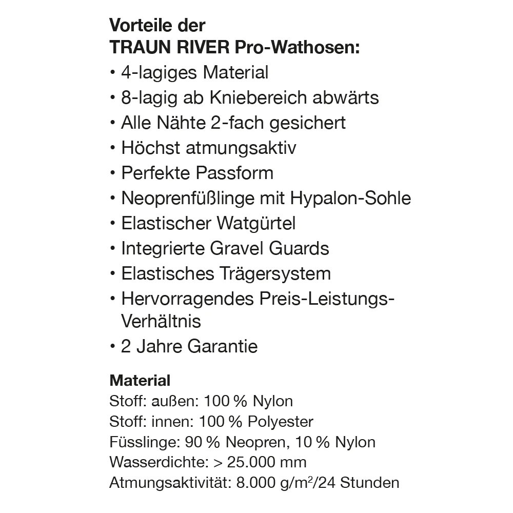 Achten Sie auf verstärkte Kniebereiche sowie auf doppelte Nähte und gute Tapings, die die Haltbarkeit der Hose erhöhen. Hierbei ist auch darauf zu achten wie viele Lagen das Material der Wathose besitzt. In der Regel werden heutzutage gute Wathosen aus einem 3- oder 4-lagigem Material gefertigt. Auch die Qualität und Dicke der Neoprenfüßlinge sind entscheidend für den Komfort und die Haltbarkeit der Wathose. Hier sollte der Füßling mit einem druckresistenten und auf der Laufsohle höher verdichteten Neopren ausgestattet sein, um dem Körpergewicht stand zu halten.