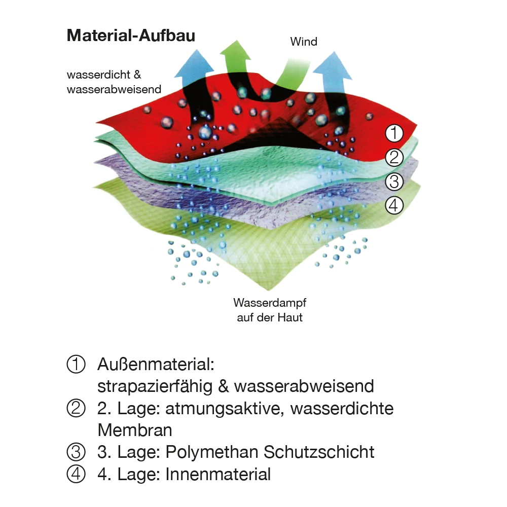 Eine hochwertige atmungsaktive Wathose besteht in der Regel aus einem speziellen Material wie „Gore-Tex“ oder einem ähnlichen wasserdichten, aber atmungsaktiven Stoff. Hier gibt es mittlerweile unzählige Hersteller die wasserdichte Stoffe mit atmungsaktiver Membran herstellen. Hierbei ist zu unterscheiden, ob das Material aus Nylon oder Polyester hergestellt wird. Wir bevorzugen namhafte Markenhersteller. Achten Sie darauf, dass die Hose eine gute Luftzirkulation ermöglicht, um Feuchtigkeit von innen nach außen abzuleiten, während gleichzeitig das Eindringen von Wasser von außen verhindert wird.