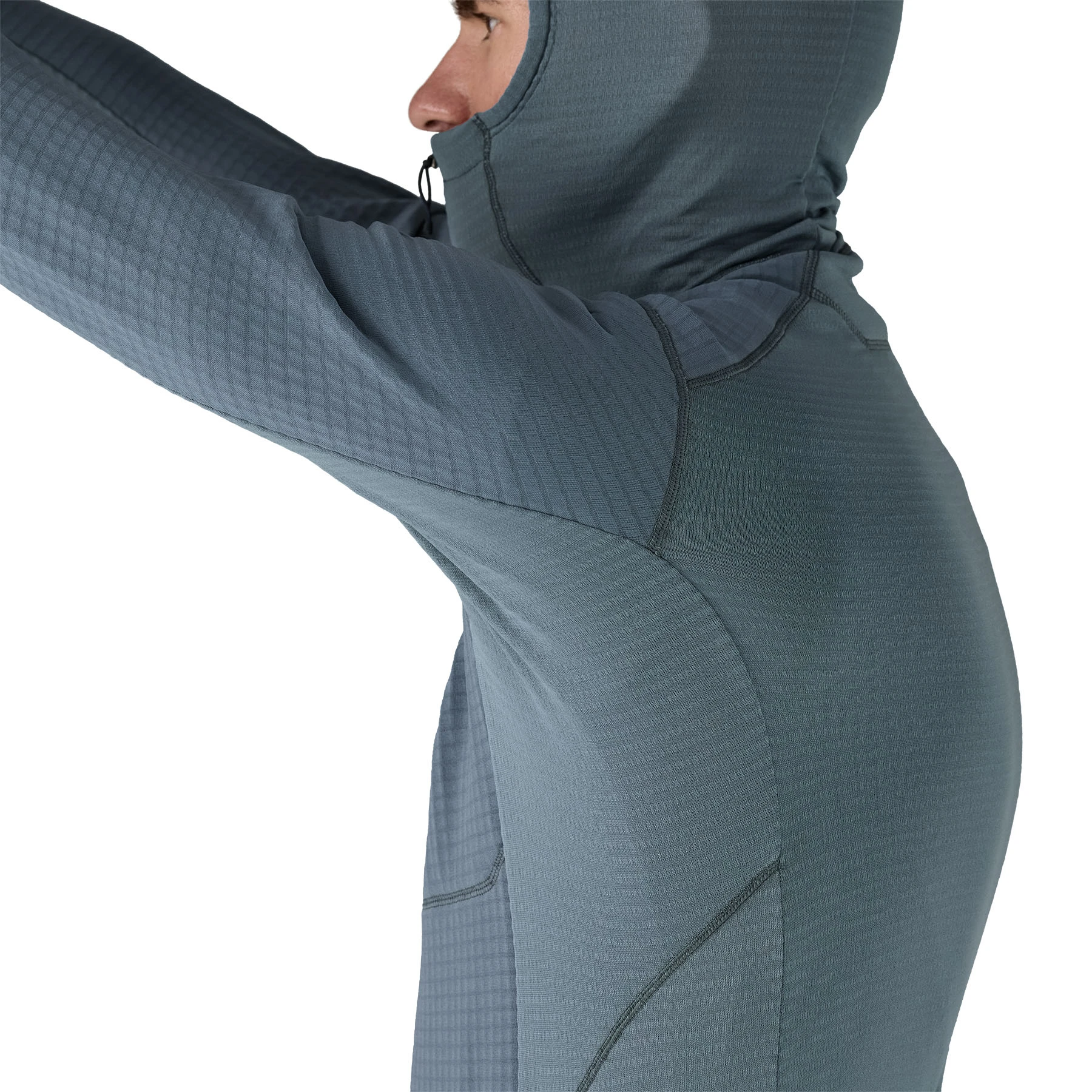 - Hood, back, lower body, inner-arm and side panels, and lower sleeves: 3.8-oz Polartec® Power Grid™ 92% recycled polyester/8% elastane Jersey