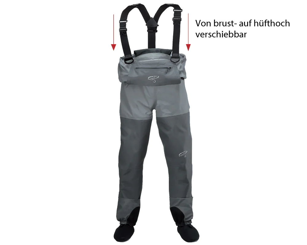 The newly reworked TRAUN RIVER Premium Waders has more freedom of movement and more flexibility in regards to carrying options. The 5-layer breathable high-performance fabric is now featured from the thigh down. As a result, the leg areas including knees are well protected against abrasion and damage by bushes and stones. The 4-layer material, which is used from the thigh upwards, increases the freedom of movement in the hip and completes the design. Also newly revised is the carrier system, which now allows the waders to be pushed down to the hips. It was important to us that this is as simple as possible, which is why you only have to adjust the front straps because the back straps follows automatically. Two D-rings on the straps also hold small utensils. The outer breast pocket, with water-repellent zipper, also has an underlying fleece hand warmer for adverse conditions. Sufficient storage space can be found in the practical inner pocket with zipper and two mesh pockets. An elastic waders belt and an adjustable drawstring in the chest provide security in the deeper wading. The integrated Gravel Guards with elastic closure and attachment eyelet for the wading shoes ensure that no gravel or sand gets between the wading shoe and neoprene socks. The 4 mm thick neoprene feet are anatomically shaped and the sole, made of highly compressed material, defies even heavy loads.