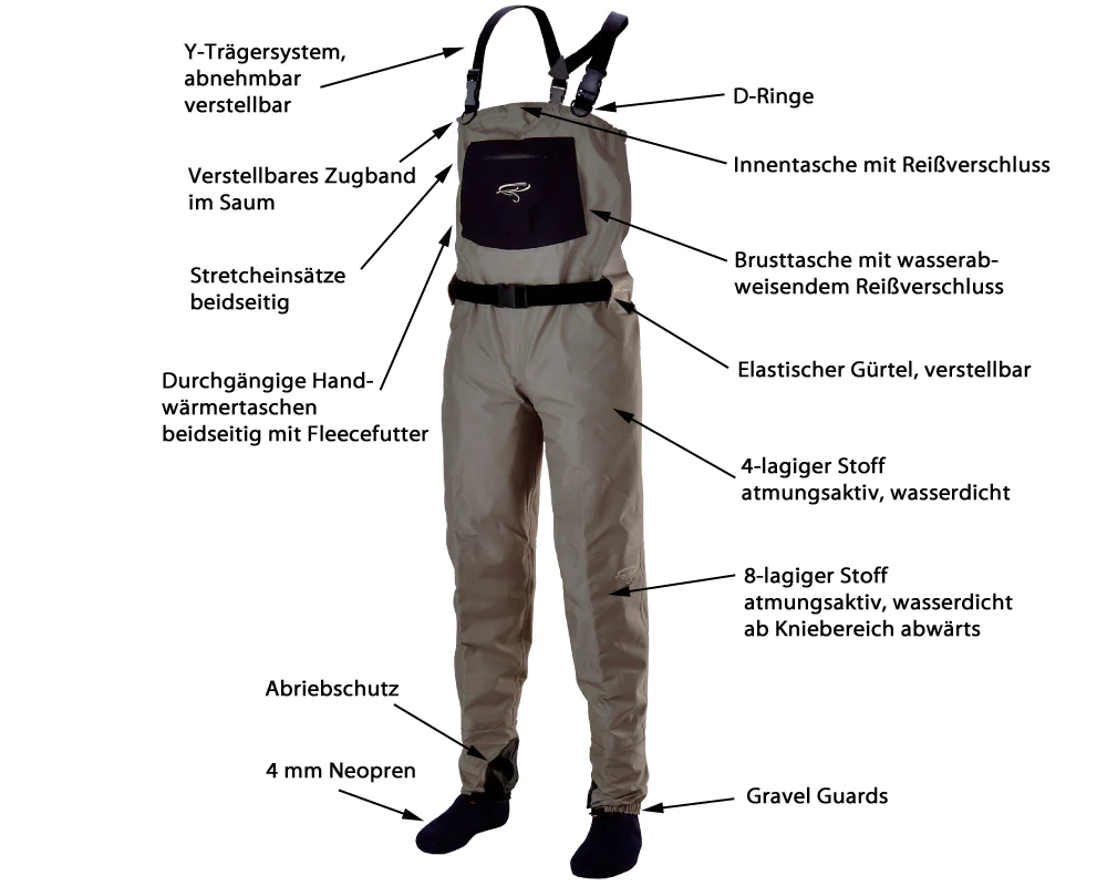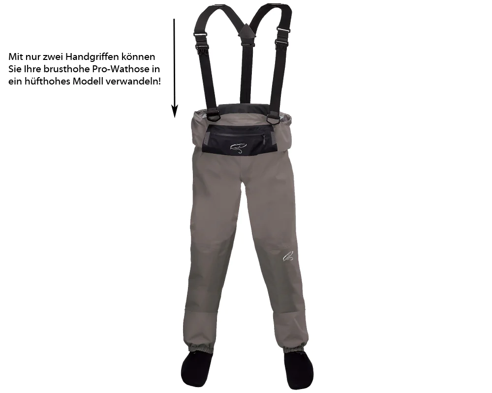 The breathable Pro-Waders is the bestseller among the Traun River waders. The pants impress with their breathability, robustness, functionality and modern design. New in this revised model is the carrier system, which now allows the waders to go down to the hip. It was important to us that this is as simple as possible, which is why you only have to adjust the front and the the back will automatically follow. The outer breast pocket, with water-repellent zipper, also has an underlying fleece hand warmer for adverse conditions. Sufficient storage space can be found in the practical inner pocket with zipper and two mesh pockets. The Traun River Pro waders can be worn chest-high or waist-high.