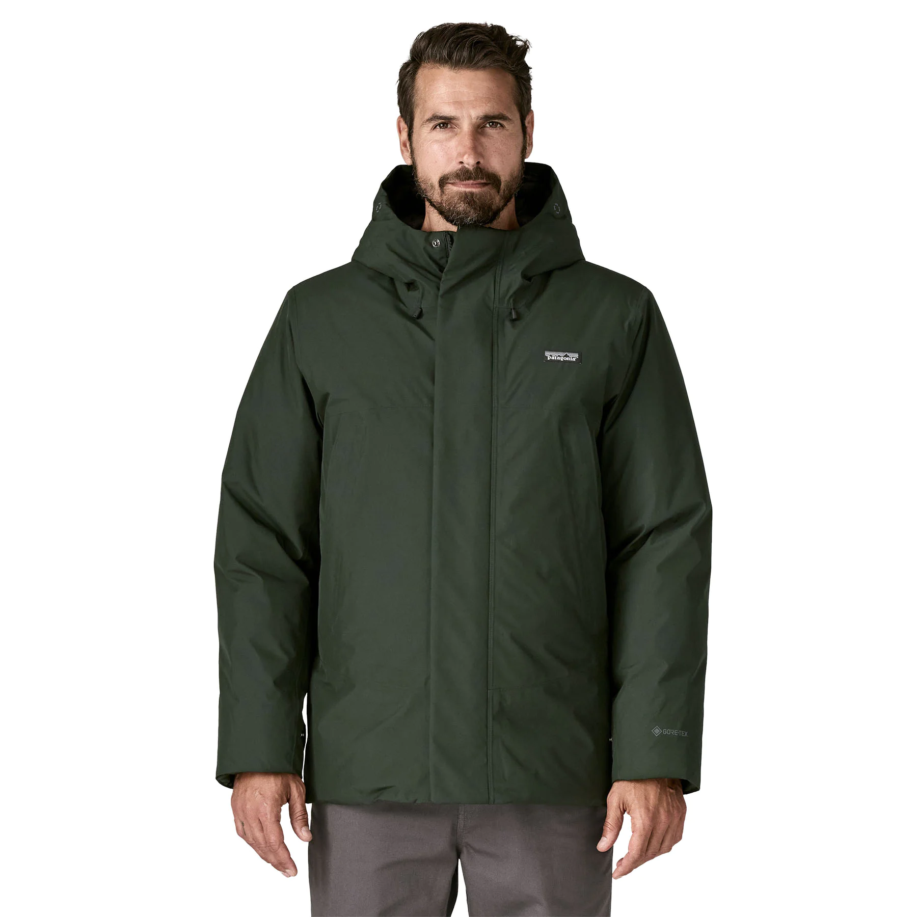 One of Patagonia's warmest parkas, the hooded Stormshadow Parka is waterproof and insulated with 700-fill-power 100% Recycled Down (a blend of duck and goose down and waterfowl feathers reclaimed from down products). The adjustable hood, cinchable waist and brushed tricot-lined pockets add warmth and comfort. Phone pockets inside the handwarmer pockets and a zippered chest pocket that’s accessed without unzipping the parka also help conserve heat. Built from premium 100% recycled GORE-TEX ePE face fabric, which is partially made from BIONIC® recycled coastal and marine plastic sourced in Costa Rica, the fabric, membrane and DWR finish are made without intentionally added PFAS.