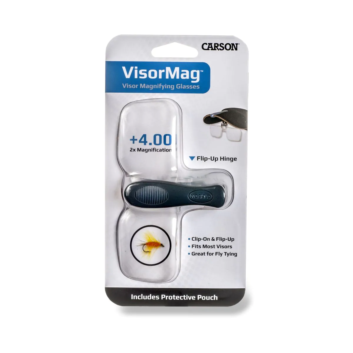 The VisorMag™ Clip-On Magnifying Lens for Hats or Caps is a set of clip-on, flip-up magnifying glasses that attach to the brim of most caps and hats. Perfect for tying flies on the leader, making knots, fly-tying and all fly-fishing needs. Complete with protective soft-pouch, its crystal clear acrylic lenses give you a sharp, distortion-free view that allows you to see even the finest details with ease. The magnifying glasses are available in different diopters and magnifying power. Keep these clip-on magnifier lenses in your tackle box so you “always have them at the ready.”