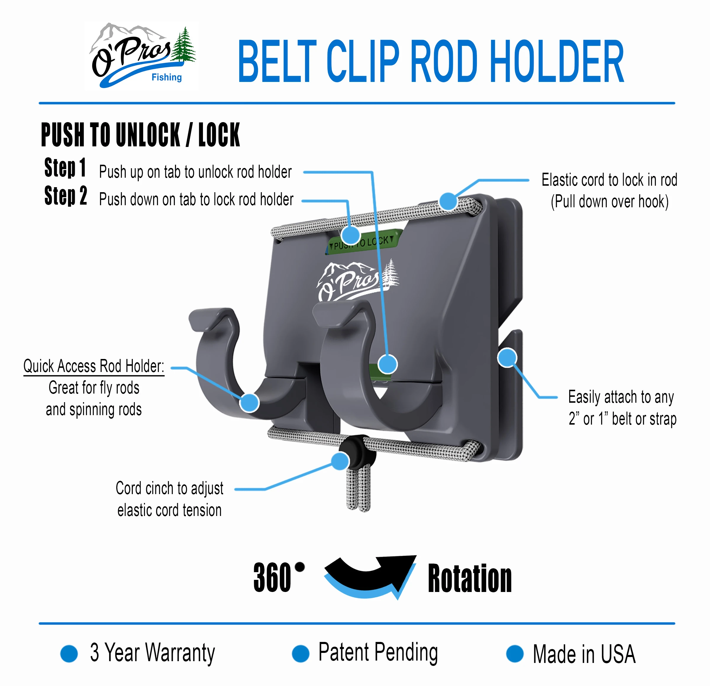 Mit Hilfe des O'Pros Rutenhalters können Sie im handumdrehen Ihre Rute fixieren und schon haben Sie Ihre Hände wieder frei! Legen Sie einfach Ihre Rute in den Rutenhalter, wählen Sie den gewünschten Winkel, arretieren Sie ihn und Sie haben sofort eine dritte Hand, die die Rute an Ort und Stelle hält. Das Produkt ist äußerst praktisch und hilfreich. Der neue "Belt Clip Rod Holder" ist die Weiterentwicklung seines Vorgängers, mit einer überarbeiteten Rotation, einem Schiebeverschluss zur Arretierung und einem aktualisierten Gürtelclip-Design für sicheren Halt am Gürtel.