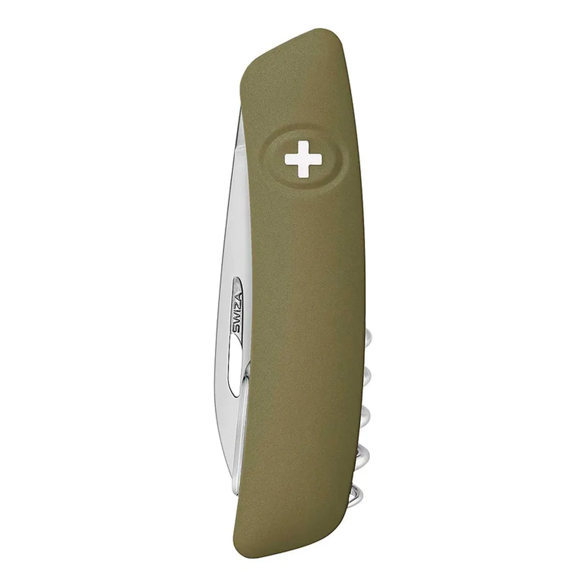 - Extra starke Klinge aus Edelstahl 440/57 HRc. mit Sicherheitsarretierung, die durch Druck auf das SWIZA Kreuz entriegelt wird.
