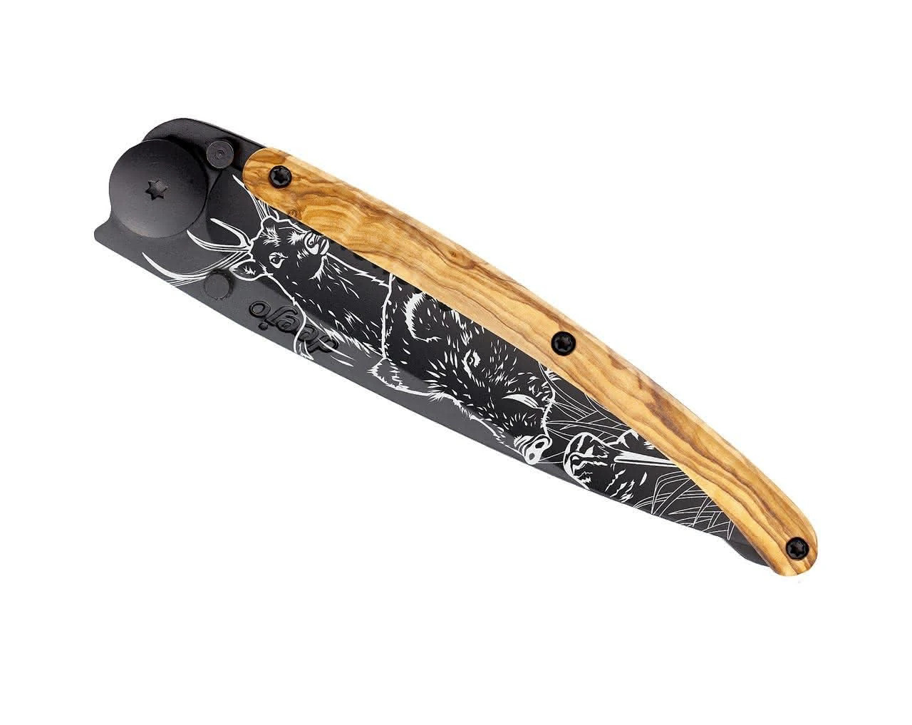 Produktinformationen "Serrated 37g Olivenholz, Tattoo "Jagdszene" Taschenmesser"