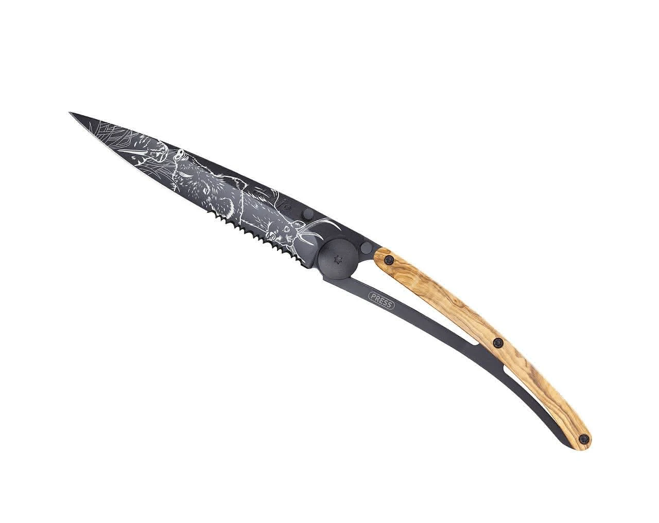 Ultraleichtes Messer aus Z40C13 Edelstahl mit schwarzer Oberfläche. Halbseitig gezahnte Klinge mit ‚Liner-Lock‘ Sicherheitssperre dekoriert mit einer feinen Lasergravur. Gürtelclip. Der Griff ist mit Olivenholz besetzt. Olivenholz ist bekannt für seine Robustheit und antibakteriellen Eigenschaften. Fans lieben die natürliche Maserung, die je nach Baum und Verarbeitung unterschiedlich ist.