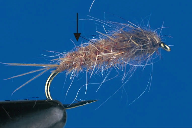 Das Dubbing ist auf einen sehr weichen Zentrumsfaden aufgebracht. Dadurch können Sie diesen Zentrumsfaden einfach einbinden und den Thorax oder Körper der Fliege wickeln.
