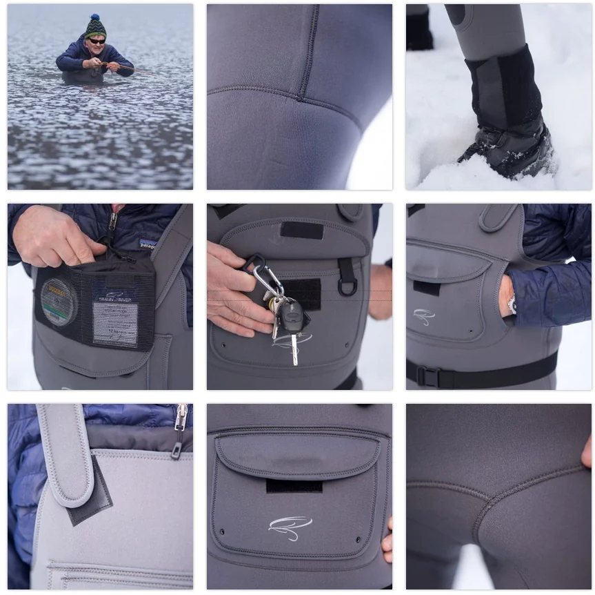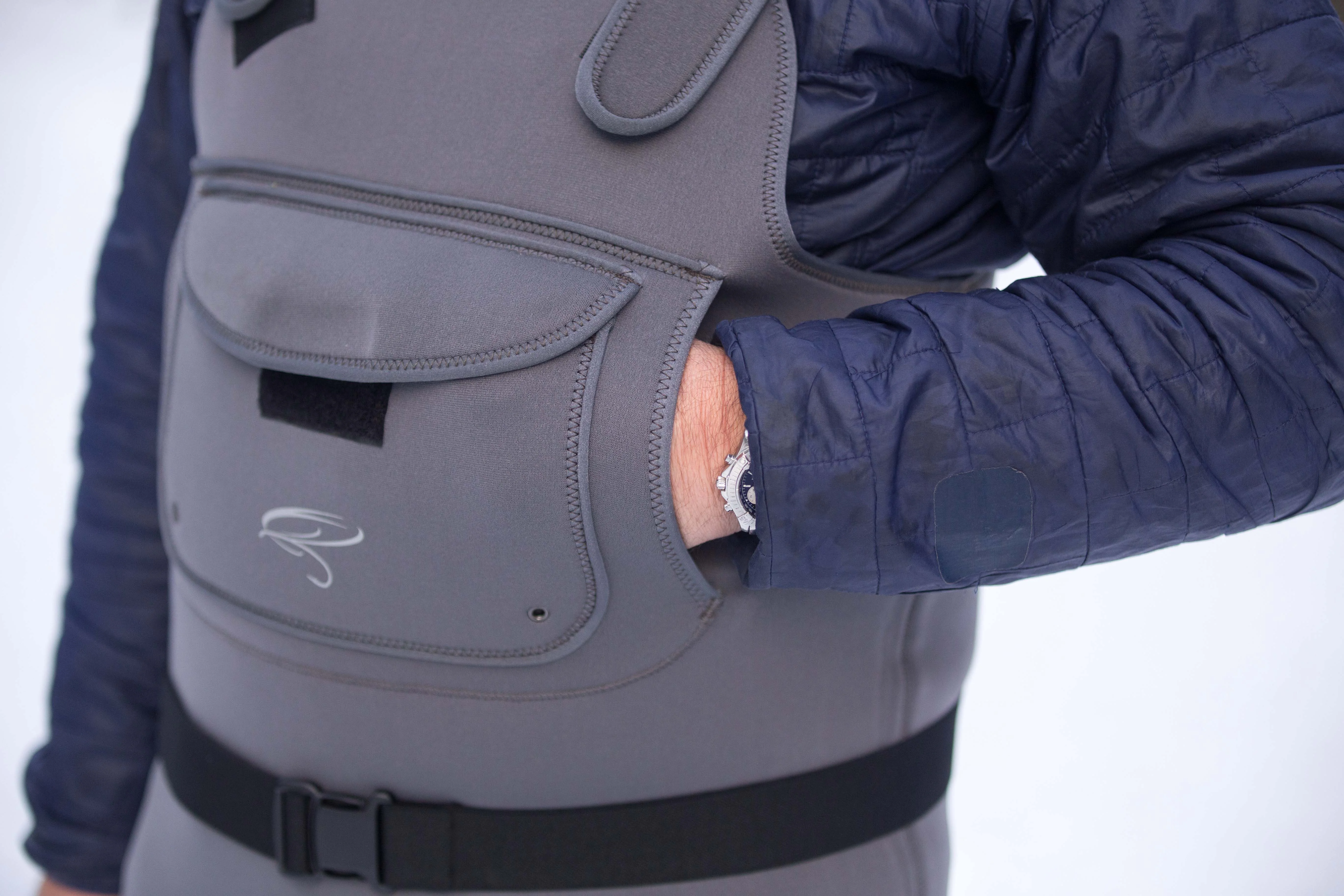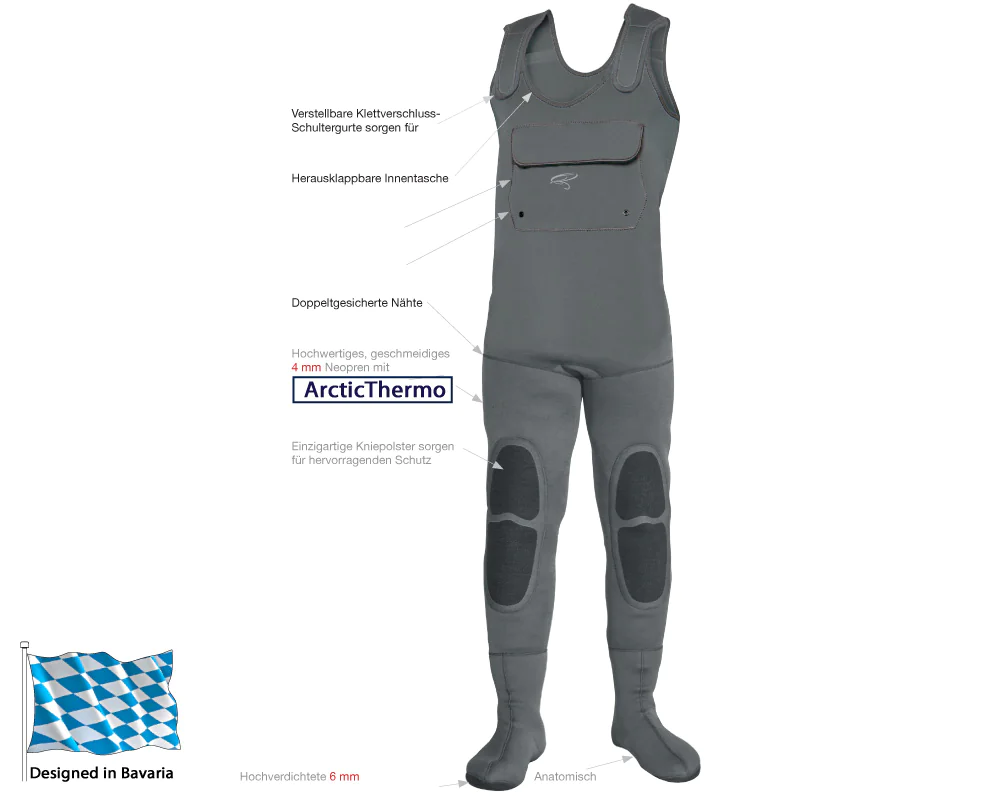 Die Superior Neopren-Wathose haben wir entwickelt, damit Sie sich in kalten Alpenflüssen, der Ostsee oder auch am Lachsfluss bequem auf die Fischerei konzentrieren können. Sie besitzt eine hervorragende Passform, trägt sich äußerst angenehm und ist zudem sehr robust. Das Hauptmaterial besteht aus hochwertigem 4 mm dickem, geschmeidigen Neopren, das innen mit ArcticThermo beschichtet wurde. Diese Thermo-Beschichtung reflektiert die Körperwärme, damit Sie auch bei kältesten Wassertemperaturen warm bleiben. Im Fußteil wird ein High Density 6 mm Neopren verwendet, damit Sie die Wathose auch nach intensivem Gebrauch nicht durchtreten können. Des Weiteren sorgen robuste Pads im Kniebereich für Abriebschutz, wenn Sie sich Fischen auf Knien nähern, oder diese zurücksetzen. Eine außen liegende Brusttasche mit unterliegender Handwärmer-Tasche, sowie eine praktische, herausklappbare Innentasche (mit RV und Netzfächern), bieten Platz für die wichtigsten Accessoires.