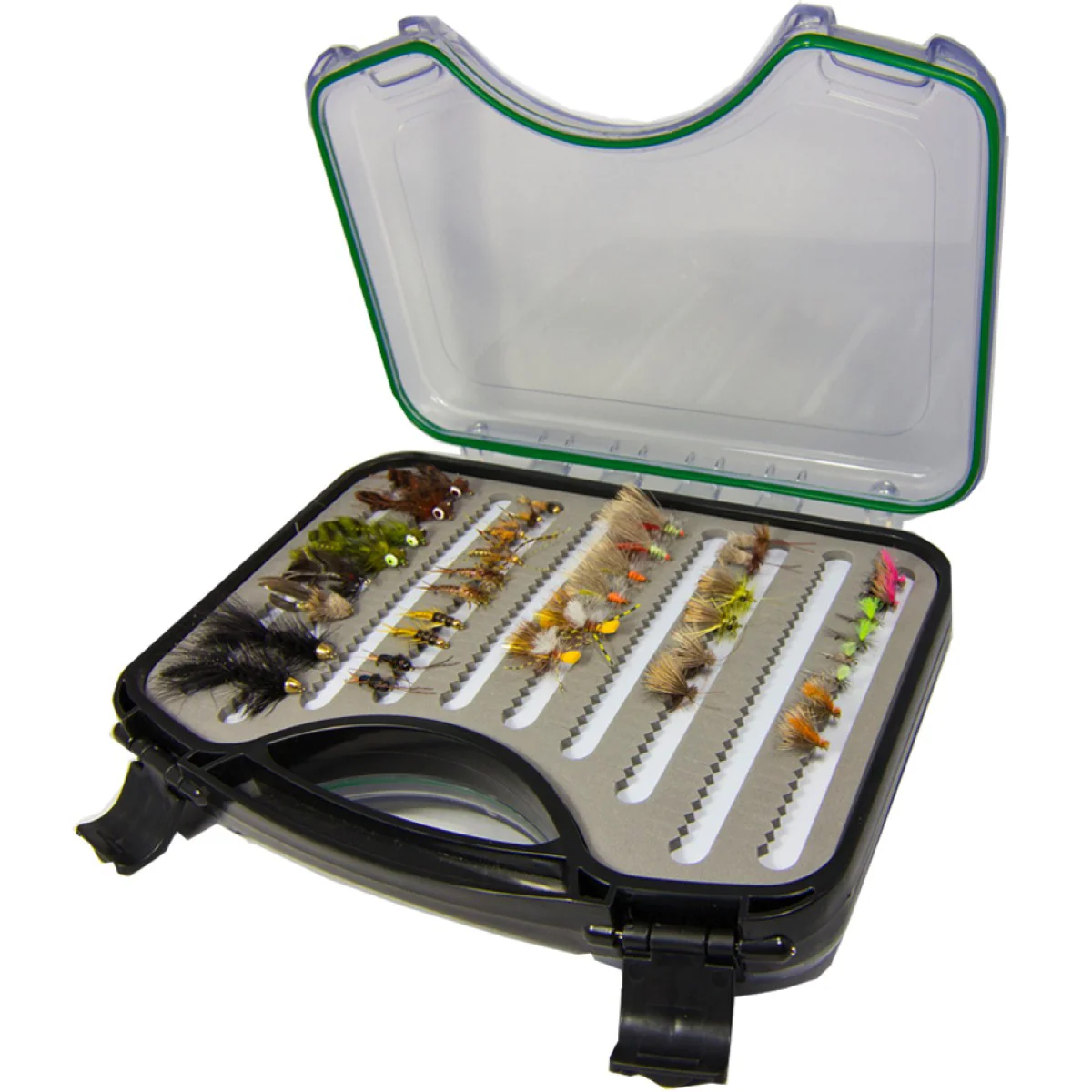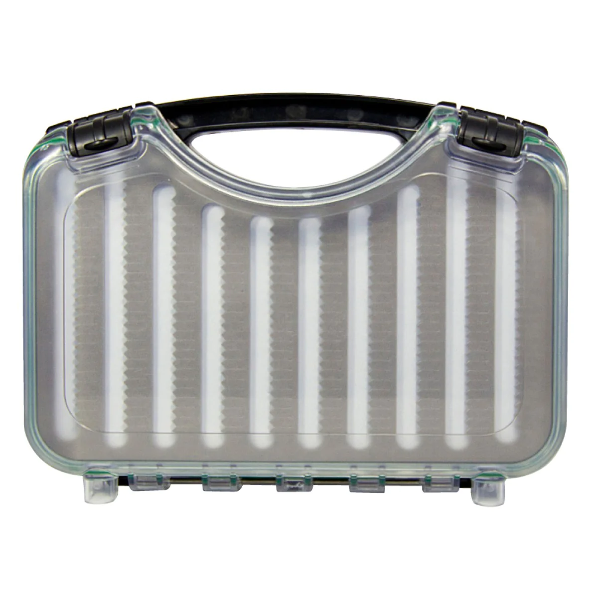 Die Mega-Fliegenbox wird all diejenigen begeistern, die beispielsweise im Boot oder im Auto immer einen gewissen Fliegenvorrat dabei haben wollen. Die durchsichtigen Deckel sorgen für den nötigen Einblick wo sich welche Fliege befindet. Zwei Dichtungsringe sorgen für die nötige Wasserdichtigkeit. Pro Seite sind 10 Reihen mit geschlitztem Schaum angebracht. Insgesamt passen ca. 450 Fliegen in die Mega-Fliegenbox.